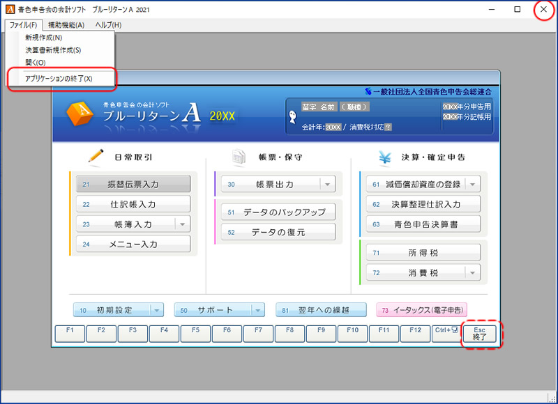 左上メニューの「ファイル」にマウスを持っていき、「アプリケーションの終了」をクリックする。